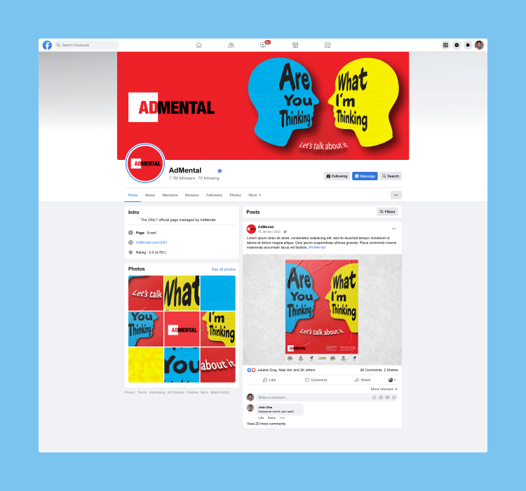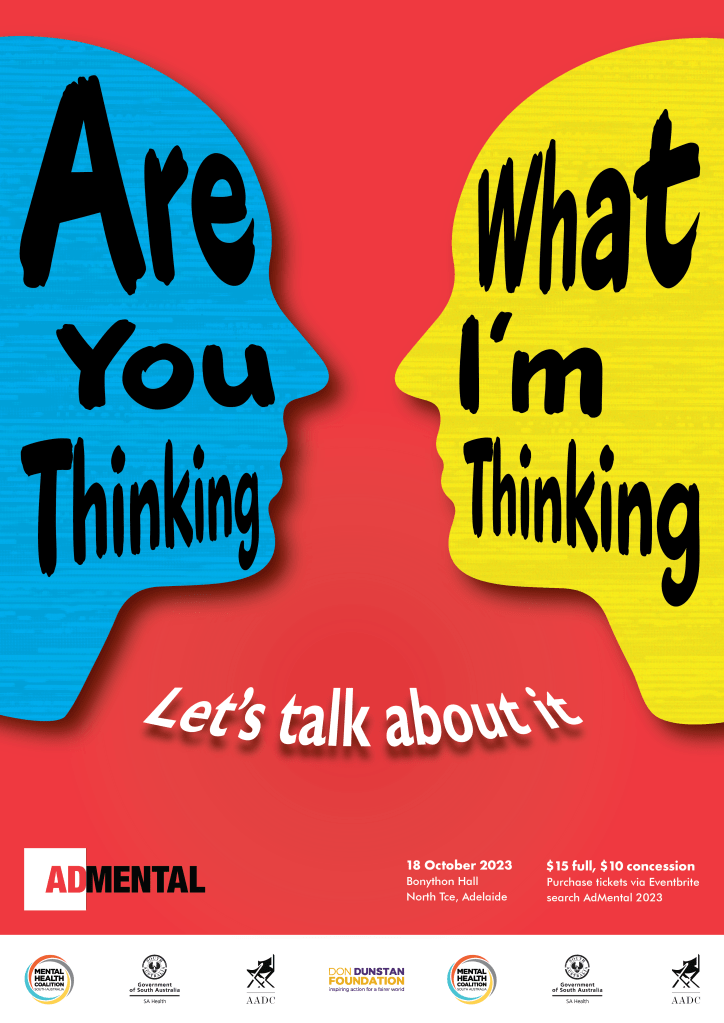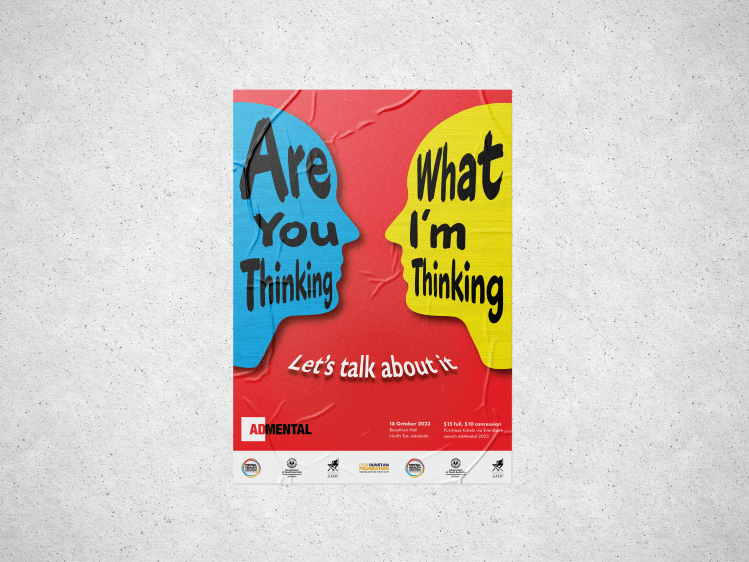 My concept focuses on questioning how the viewer thinks and if others think the same way, then encourages them to hear more about mental attitude. The words “are you thinking what I’m thinking” represents and reflects the moment when to like-minded figures have the same great idea, which in this case suggests attending the event of AdMental.