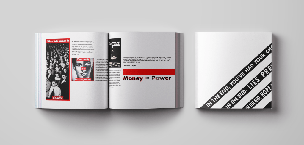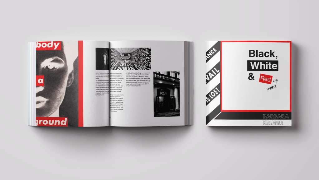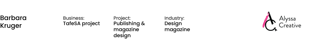For this TafeSA design project, I created a square magazine that reflected and informed readers about the work of Barbara Kruger. Due to the direction of the brief wanting to portray the designer/typographer’s style, research about the designer was essential. I reflected her style through typography, graphics, layout and colour. This task aimed to teach the importance of research and how to implement design styles based on information gathered. To ensure the magazine was an accurate depiction of Kruger’s work and visually appealing I used the high contrast of black and white elements as well as pops of red. The red draws the viewers eye in and creates hierarchy between elements.