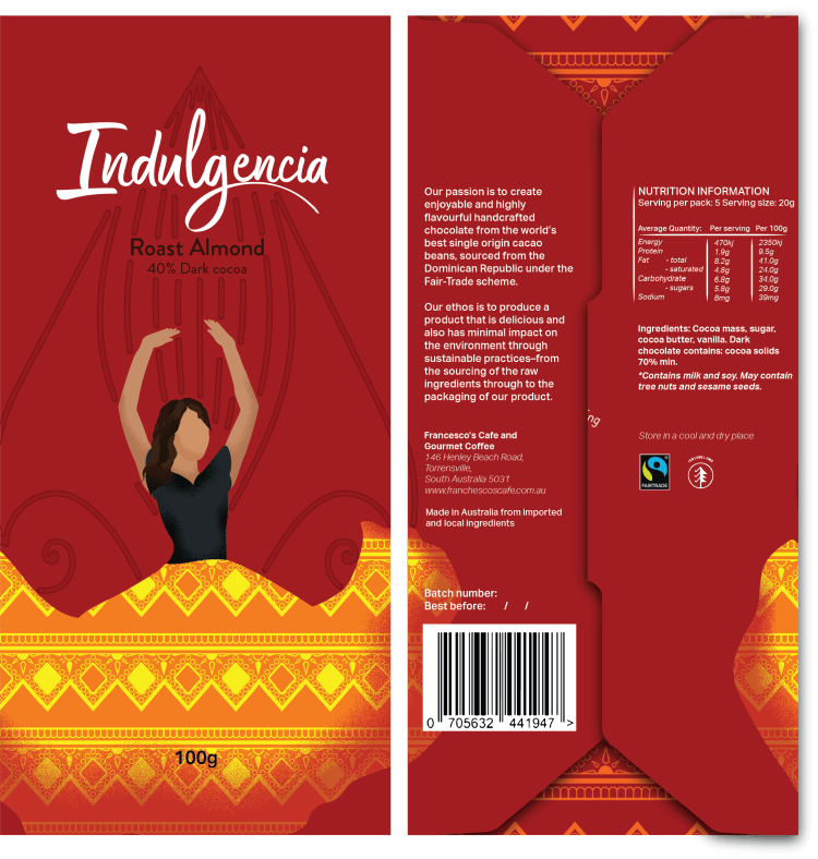 I created the brand name Indulgencia from the Spanish translation of indulge. This was chosen as I conducted interviews on the target audience. From that unique experience I was able to combine the intentions of the client and insight from the interviewee’s. Both the act and joy from indulging was what drove the target audience to buy chocolate.